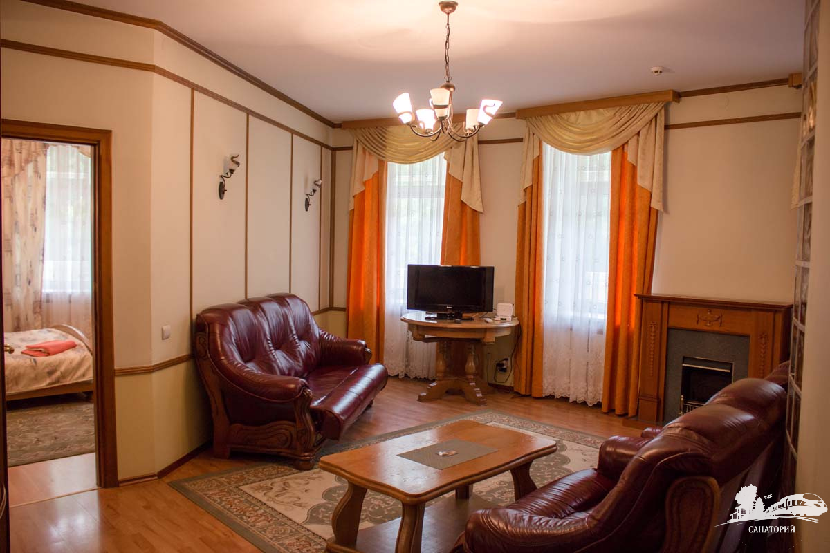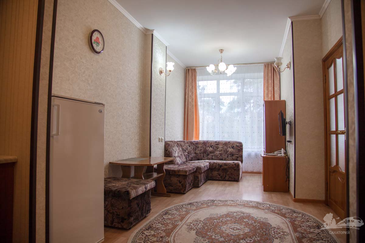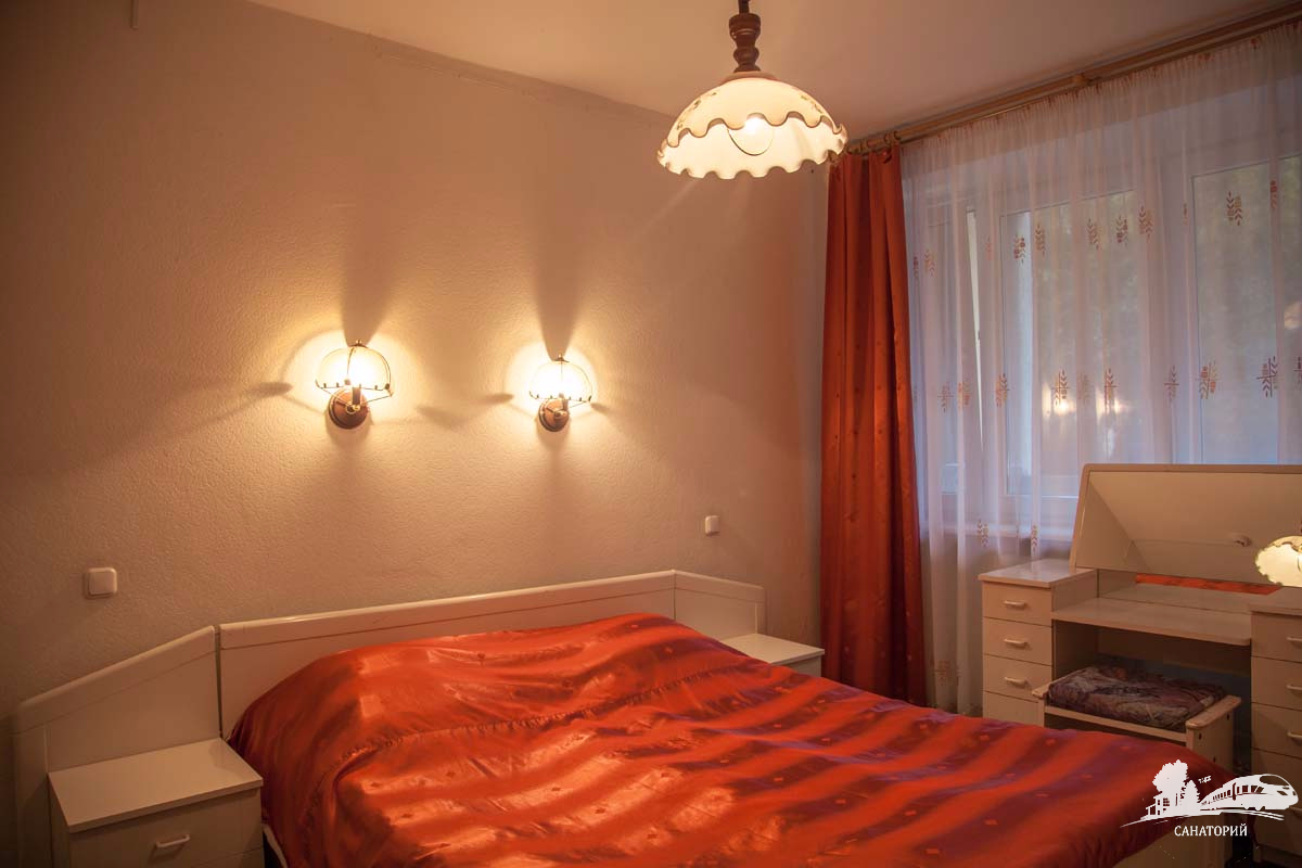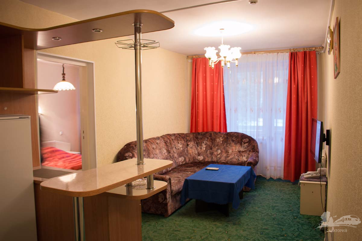 - 2-х местный 2-х комнатный Люкс дабл высшей категории в корпусе №1. В номере: туалет, умывальник, биде, ванна, холодильник, электрочайник, микроволновая печь, утюг, телевизор, телефон, wi-fi, две жилые комнаты-комната для отдыха/работы и спальня с двуспальной кроватью.