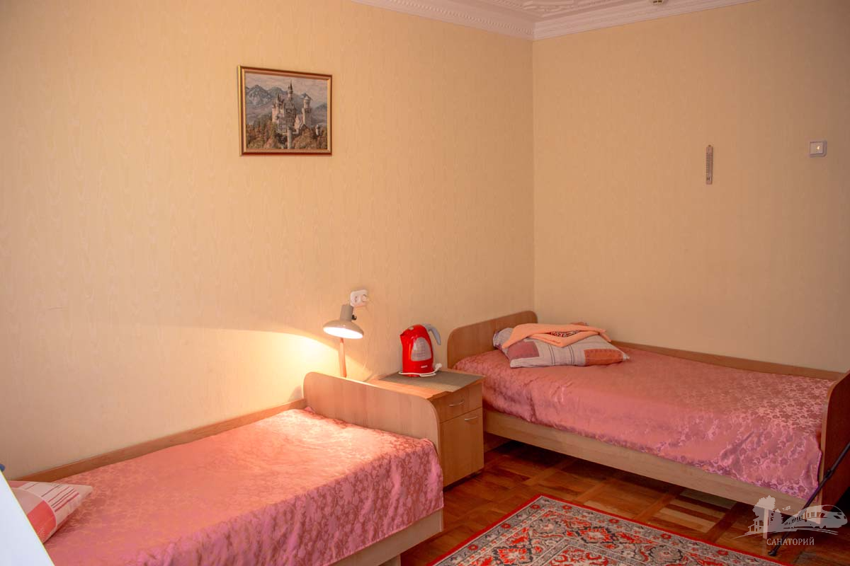 - 2-х местный Твин первой категории в корпусе №1,2. В номере: туалет, умывальник, душ, холодильник, телевизор, телефон, wi-fi, одна жилая комната с двумя односпальными кроватями.