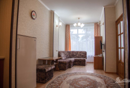 - 1-но местный 2-х комнатный Апартамент высшей категории в корпусе №3. В номере: туалет, умывальник, биде, душ, холодильник, электрочайник, микроволновая печь, утюг, телевизор, телефон, wi-fi, две жилые комнаты -гостиная/столовая с кухонным оборудованием, спальня с нестандартной широкой двуспальной кроватью (180x210см).