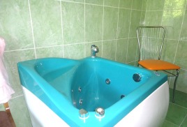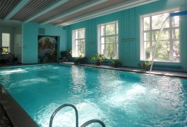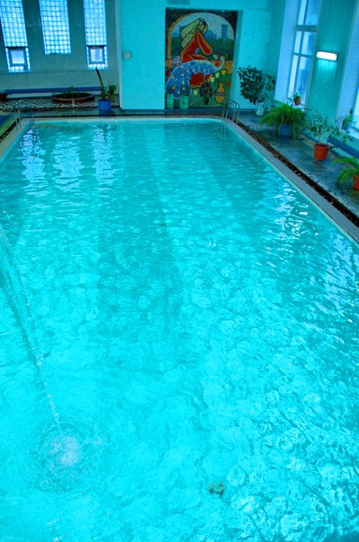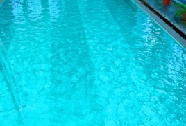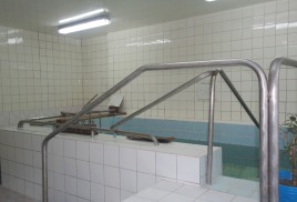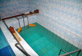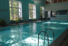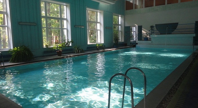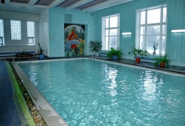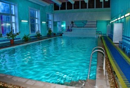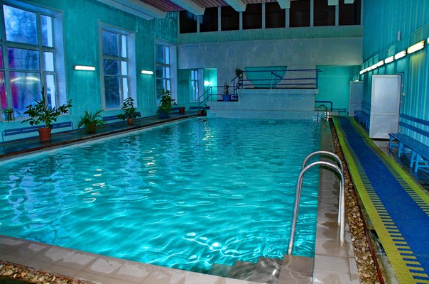 бассейн 16,5х7 м и бассейн с минеральной 4х7 м, температура воды 26 0С - 28 0С, уровень хлора – 0,7 мл/дм3, система очистки воды – фильтры песчаные.