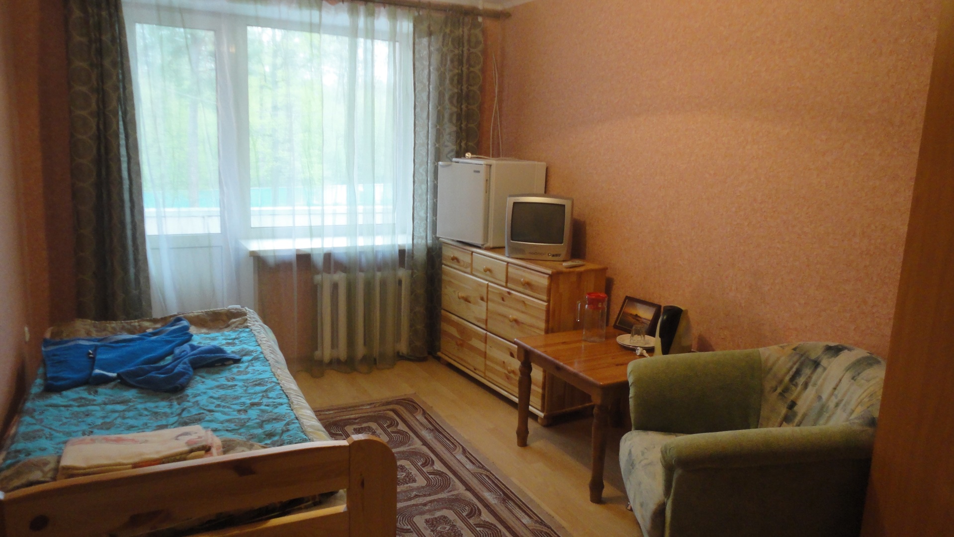 2-местный 2-комнатный (спальный корпус №1): ванна, туалет, умывальник, 2-спальная кровать, балкон, мини-холодильник, тв, утюг, фен, чайник. Возможно проживание 1 человека.