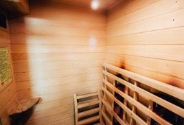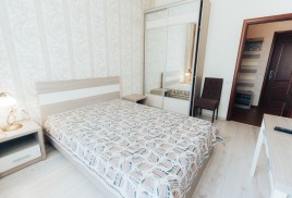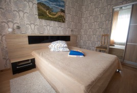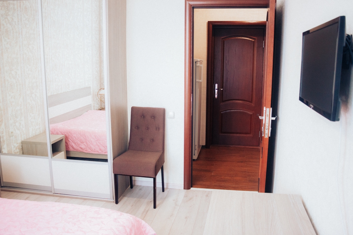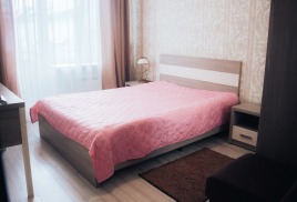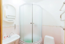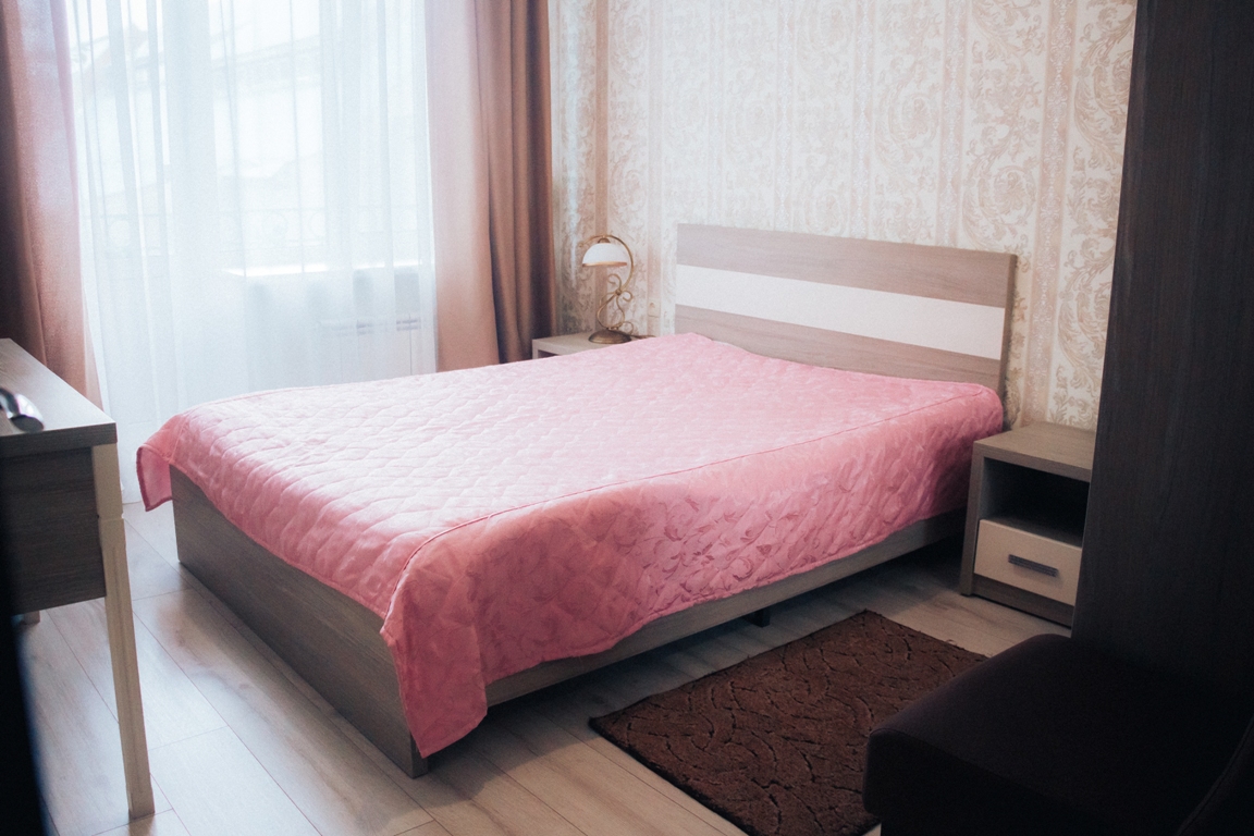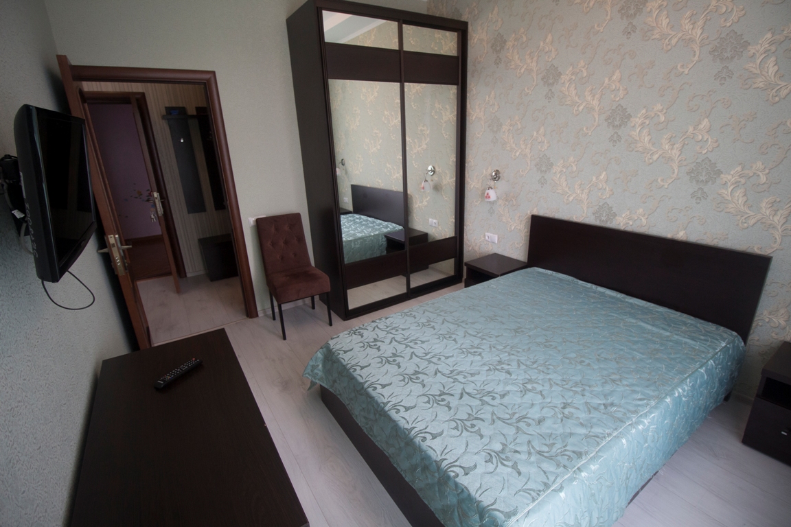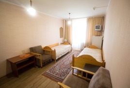 2-местный 1-комнатный номер 1-ой категории «King Size» В номере: 2-спальная кровать, кресло, телевизор, журнальный стол, шкаф, прикроватные тумбочки, холодильник. В ванной комнате: душ, туалет, умывальник, мыло, полотенца. Площадь номера 14,9 м2.