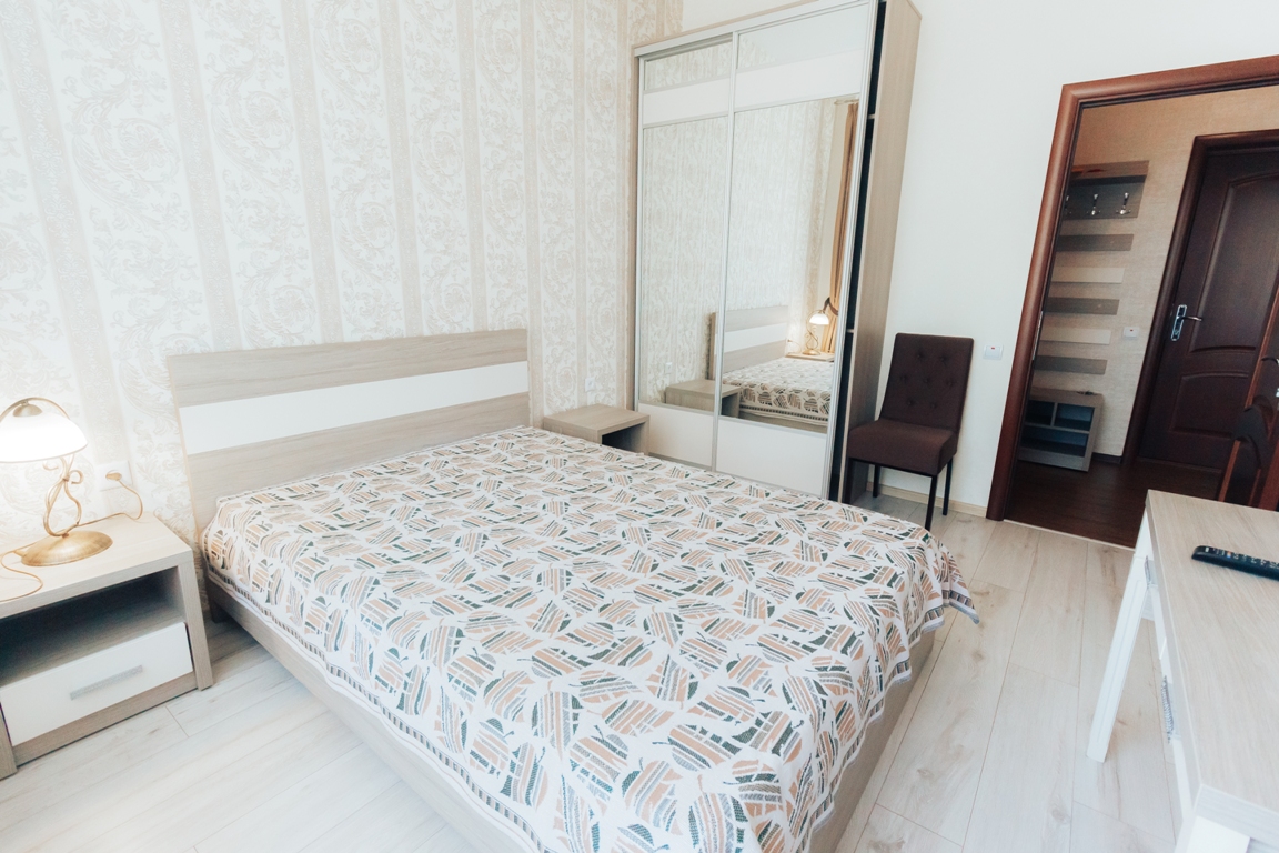 2-местный 2-комнатный номер "Люкс" высшей категории. В номере: 2-спальная кровать, 2-спальная кровать 1 шт./1,5-спальные кровати 2 шт., прикроватные тумбочки, шкаф, телевизор, холодильник, мягкая мебель и журнальный столик в гостиной, душ, туалет.