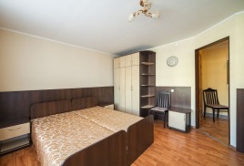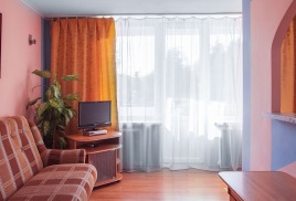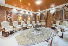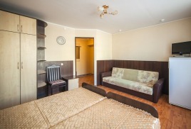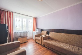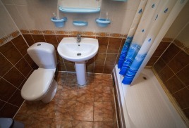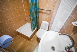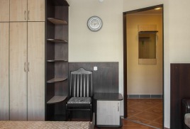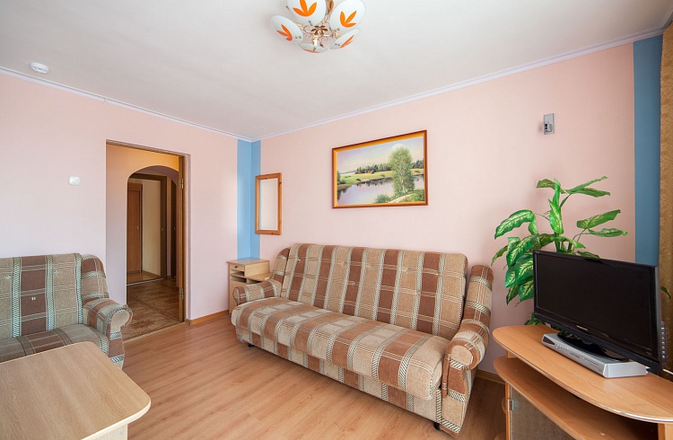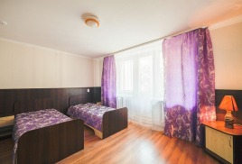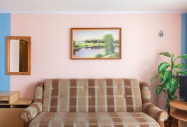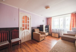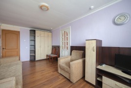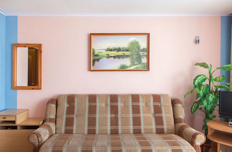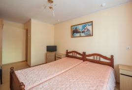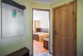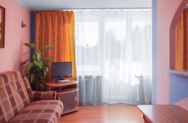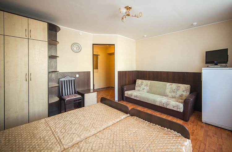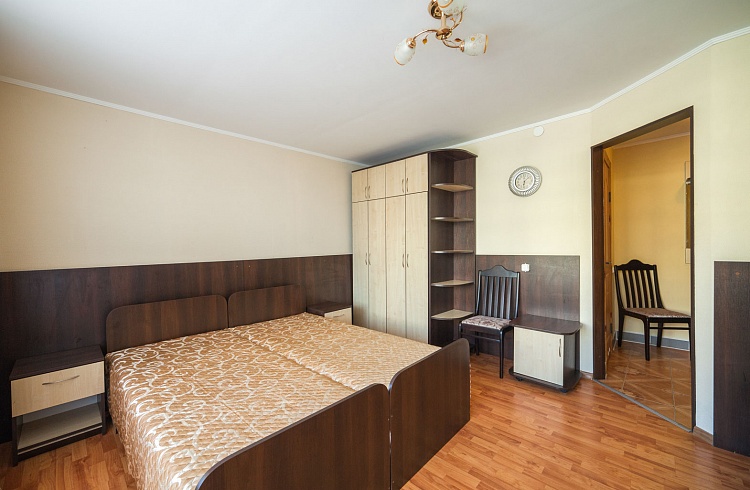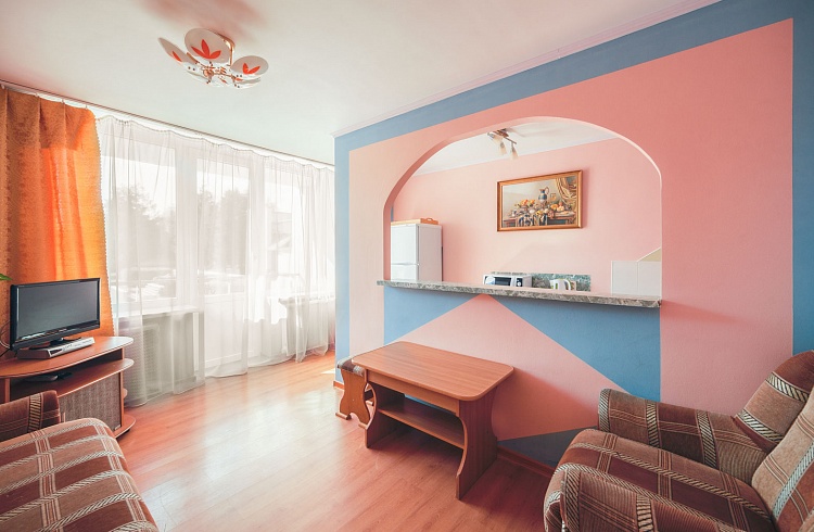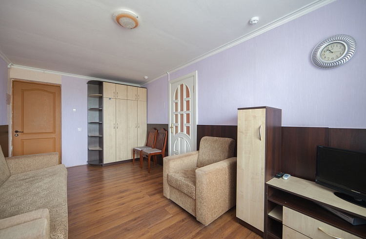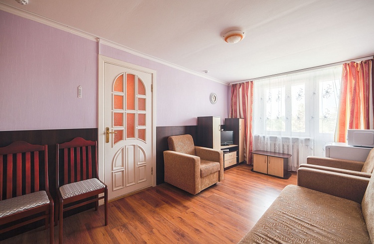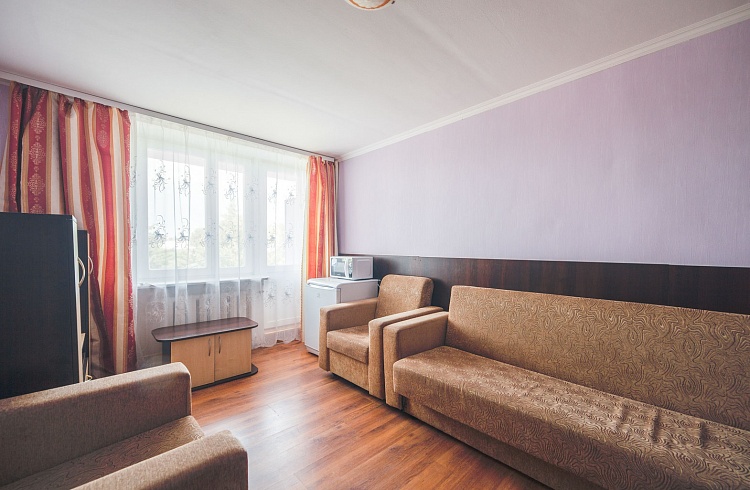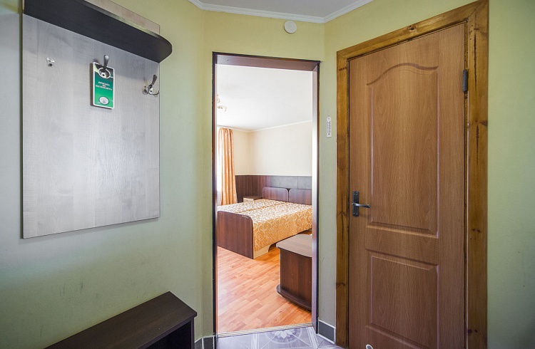 1 местный 2 комнатный номер повышенной комфортности. ( 1 корпус) 1 этаж. P номера 52,5 кв.м. В номере: 2 кровати ( 160*200),диван раскладной, 2 тумбочки (около кровати),телевизоры (40 и 50 дюйма),холодильник (50 см. высотой), посуда, чайник, стиральная машина, гладильная доска, утюг, санузел (душевая кабина, туалет), фен, стол обеденный, стулья, стол письменный.