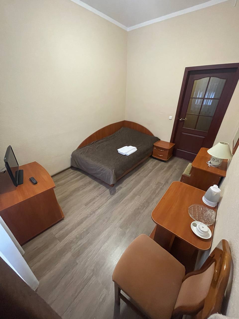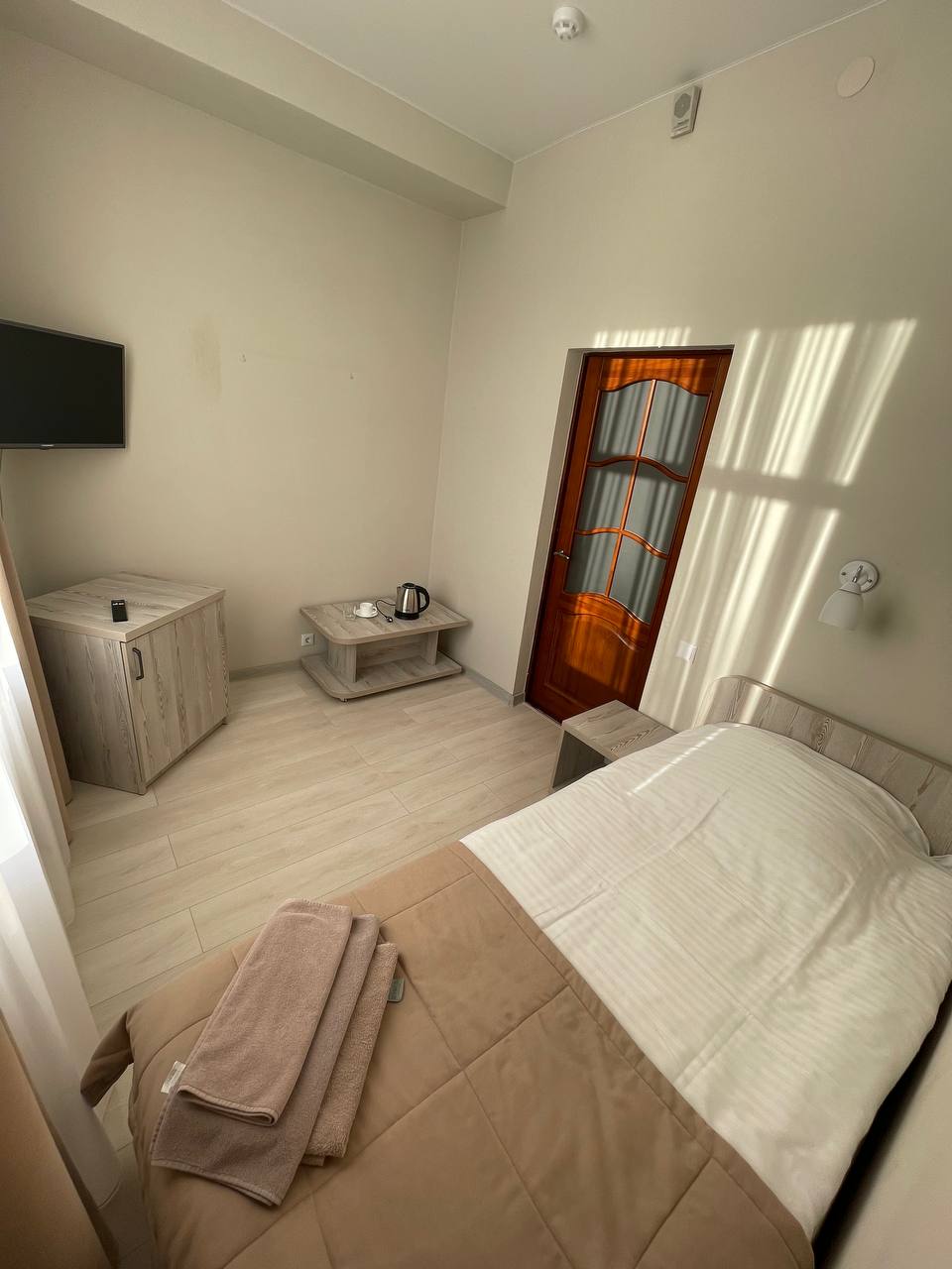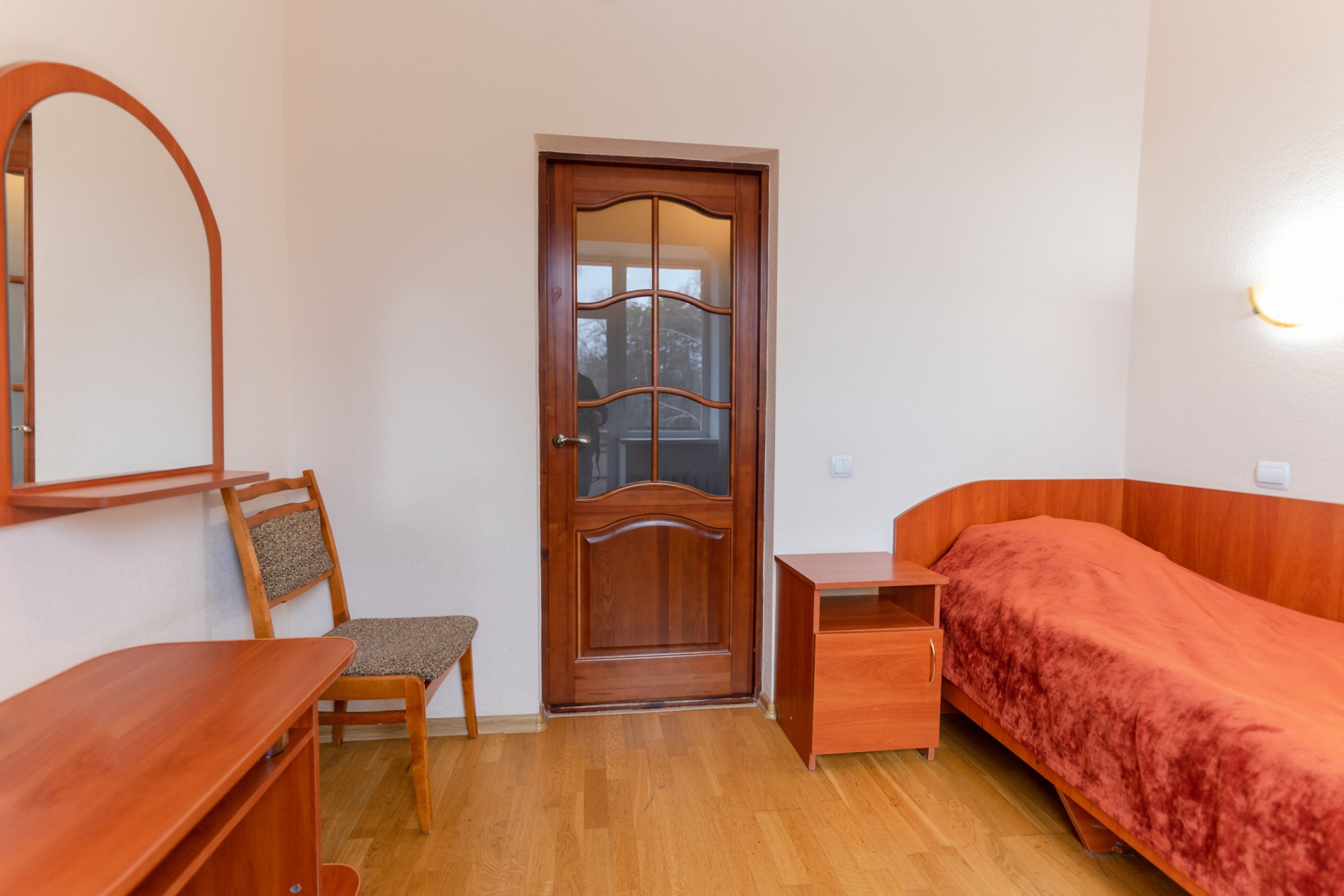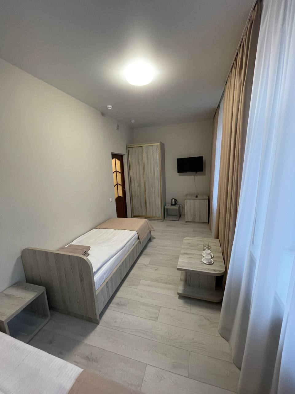 1-местный 1-комнатный Стандарт: односпальная кровать (120 см), телевизор, мини холодильник, чайник с набором посуды, санузел с душем.
