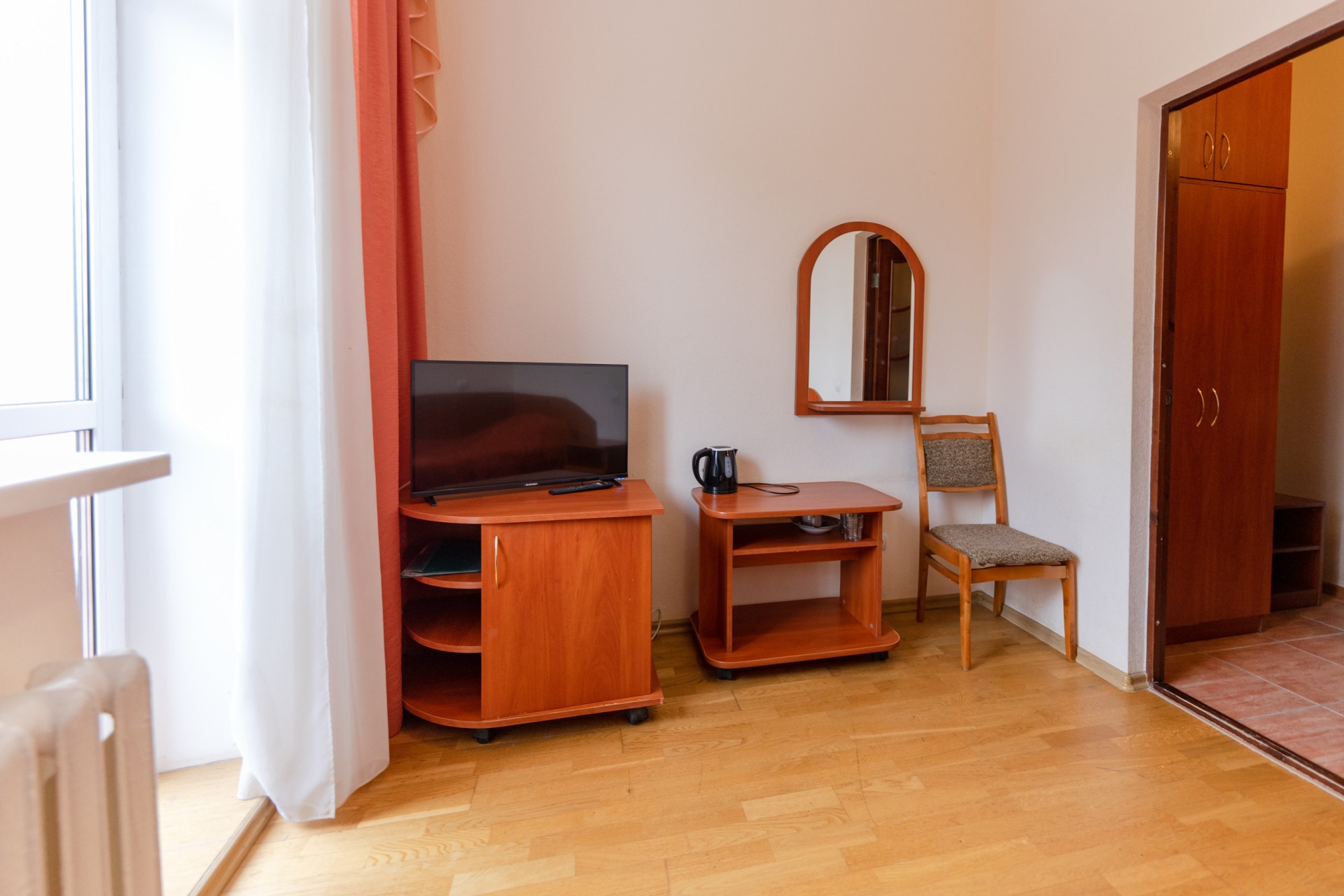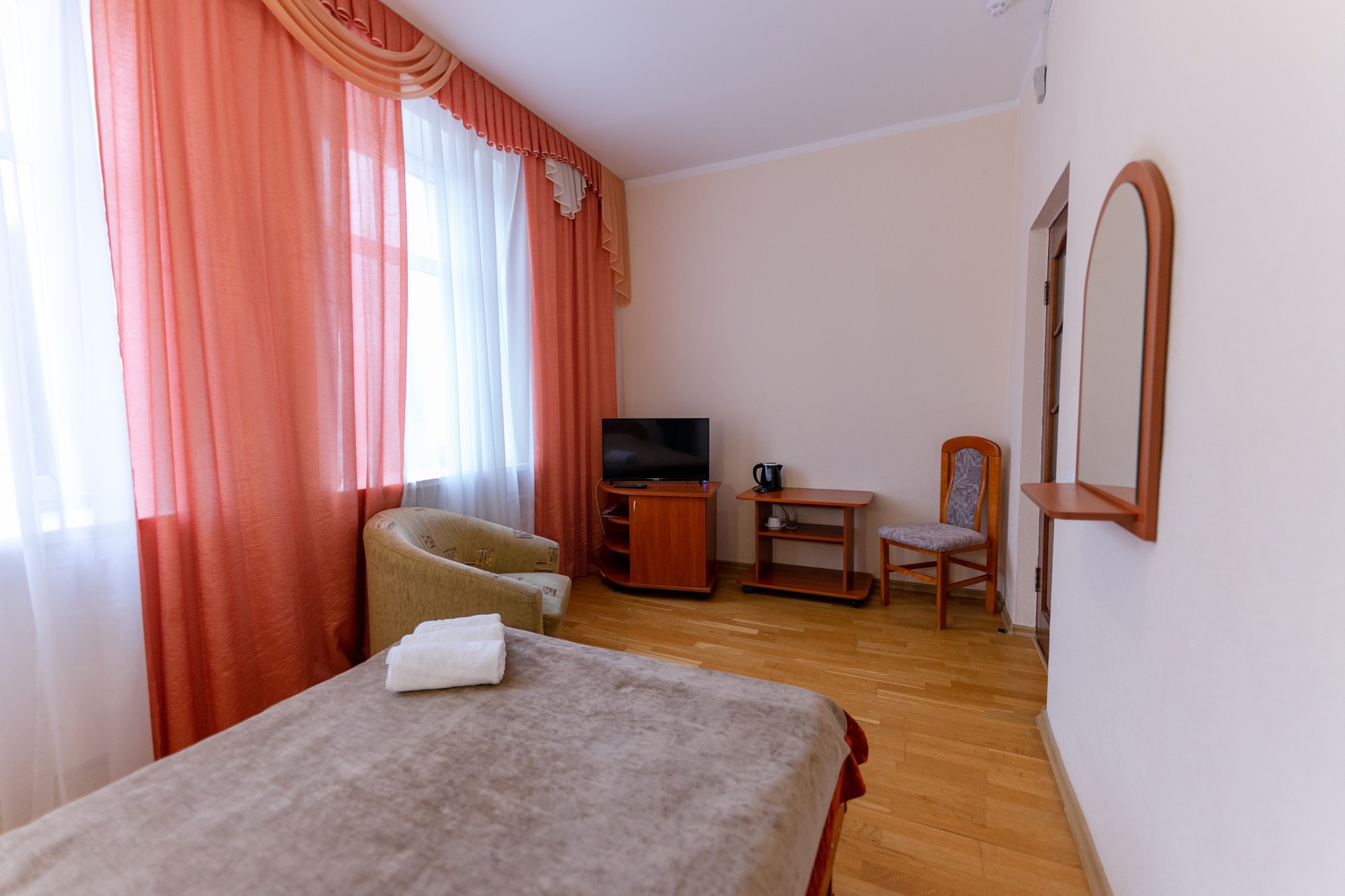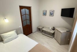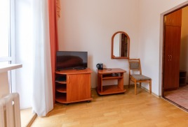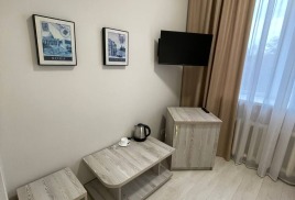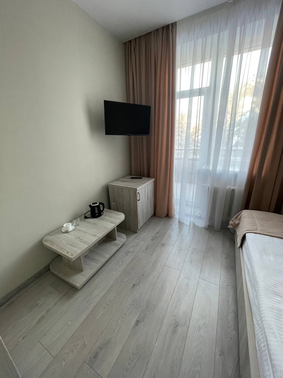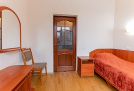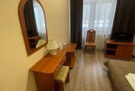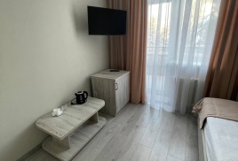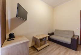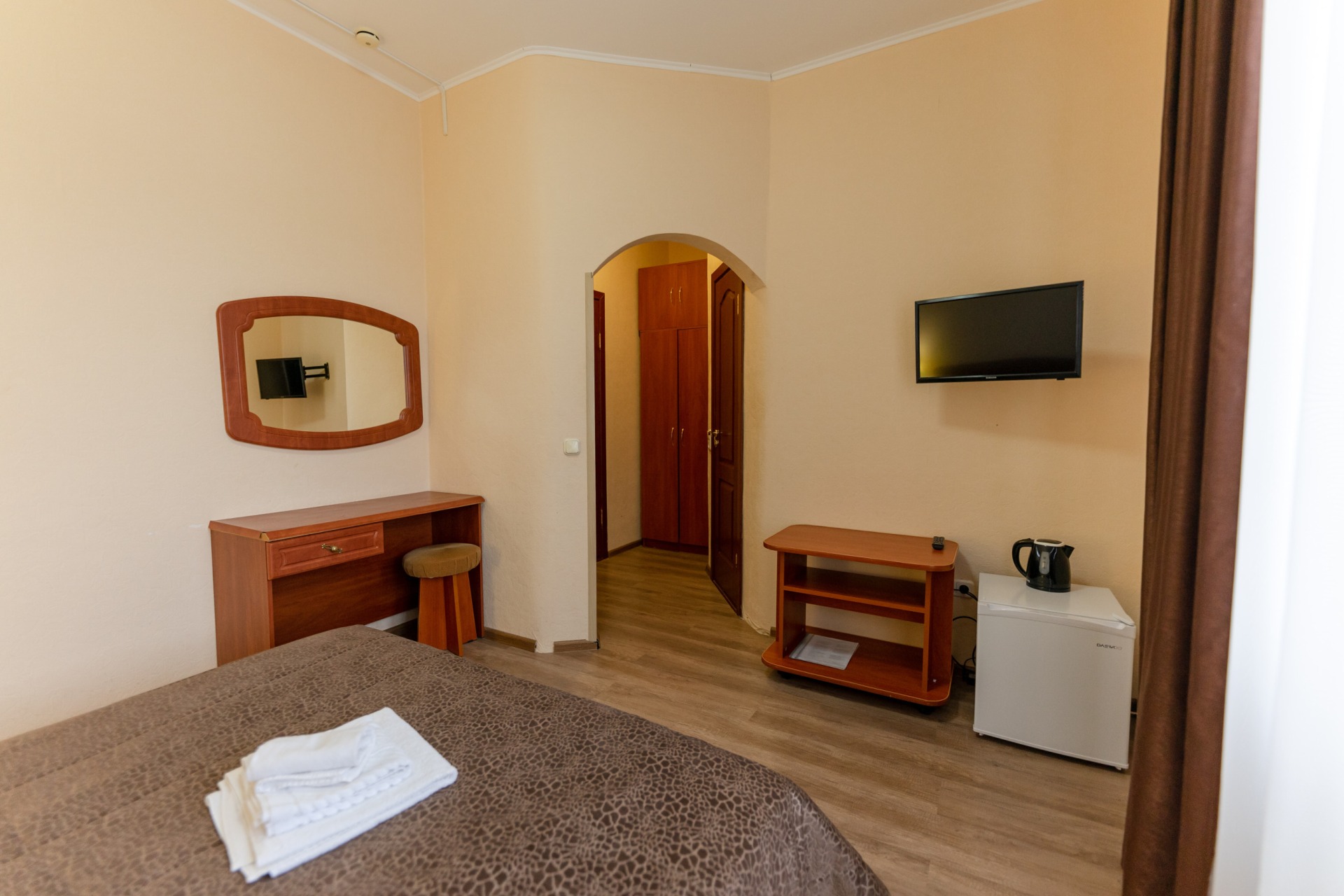 1-местный 1-комнатный Стандарт плюс: односпальная кровать (160 см), телевизор, мини холодильник, чайник с набором посуды, санузел с душем.