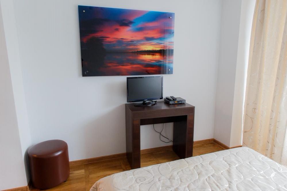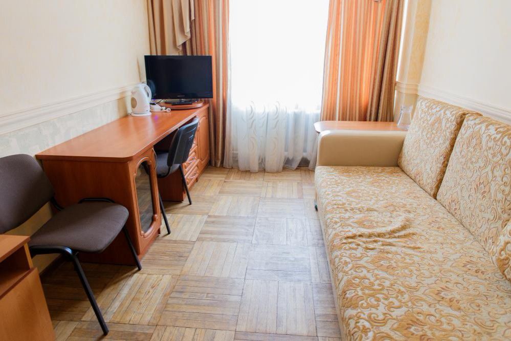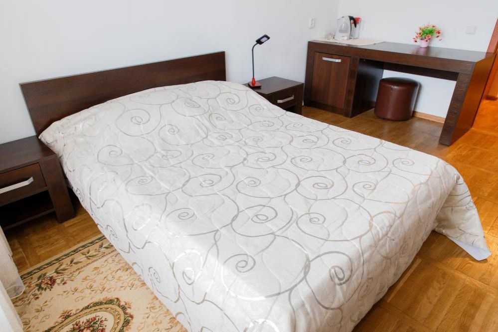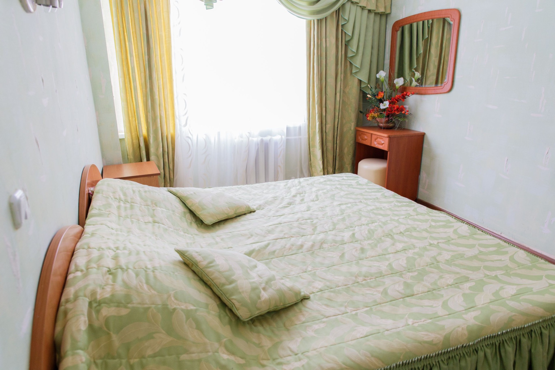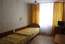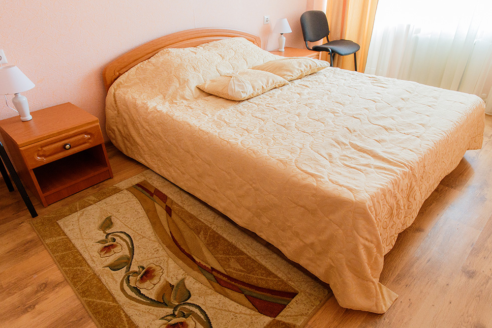 1 комнатный 2 местный СТАНДАРТ (1-7 этаж, балкон есть не во всех номерах) Общая площадь: 20 кв.м., жилая – 12 кв.м. В номере: встроенный шкаф в прихожей, журнальный столик, две тумбочки, два стула, две односпальные кровати или одна двуспальная, телевизор, холодильник, чайник, фен, кондиционер, набор посуды, душ, туалет, Wi-Fi. Возможно подселение 3-ого человека – выдвижная кровать или кресло-кровать.