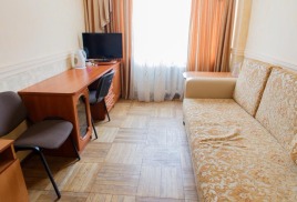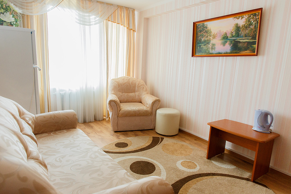 Двухкомнатный двухместный номер СТАНДАРТ (1-7 этажи, балкон есть не во всех номерах) Общая площадь: 37 кв.м., жилая – 12 кв.м. Состоит из двух жилых комнат (гостиная, спальня). В номере: встроенный шкаф в прихожей, журнальный столик и комбинированная мебель, две тумбочки, два стула, две односпальные кровати или одна двуспальная, телевизор, холодильник, чайник, набор посуды, душ, туалет, кондиционер, фен, Wi-Fi. Возможно подселение 3-ого и 4-ого человека – диван двухместный.