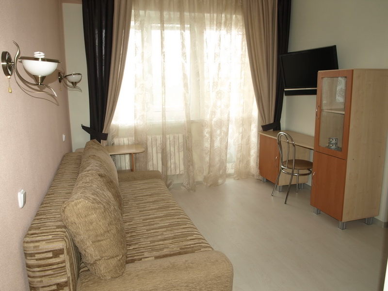 1-номестный 1-но комнатный с кроватью (0,9 м.) + раскладное кресло В номере: 1,5 кровать + кресло кровать шкаф, стол, тумбочка, стулья, телевизор (24 телеканала), комплект полотенец, холодильник, фен, электрочайник, санузел, балкон, бесплатный безлимитный wi-fi. Номера категории + ремонт 2020 года, с кондиционером