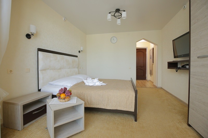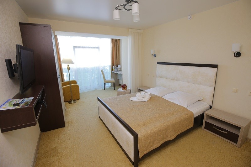 1-но местный 1-но комнатный номер с кроватью double. (корпус Приозерный, Лазурный) В номере: шкаф в прихожей, набор посуды, стол, тумбочки, стулья, телевизор (24 телеканала), утюг, чайник,телефон, wi-fi, кровать (1,4 метра), холодильник, санузел,фен, мягкое кресло раскладушка, балкон. Номера категории + ремонт 2020 года, с кондиционером.