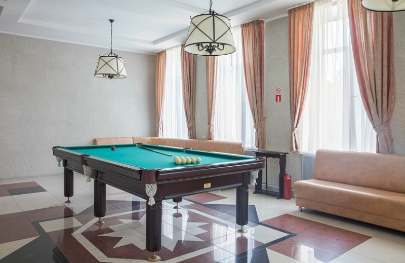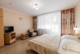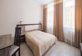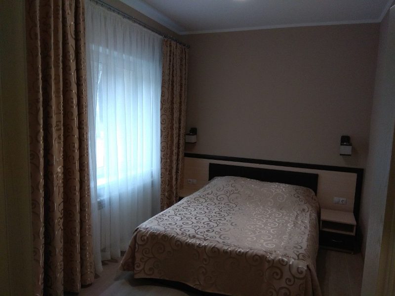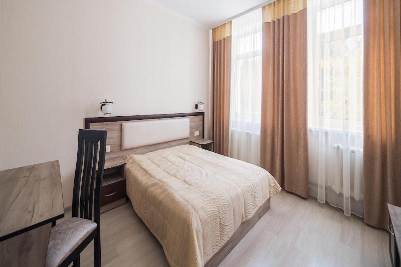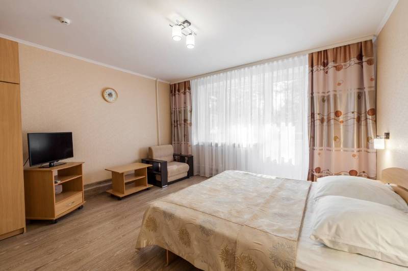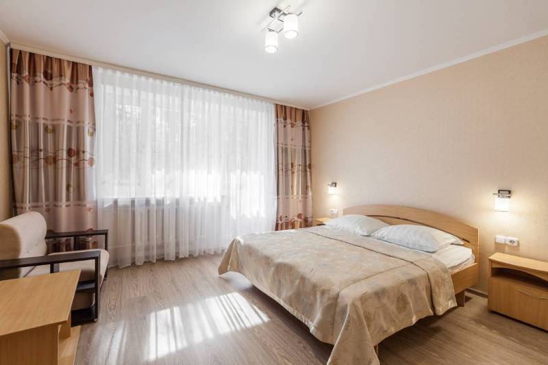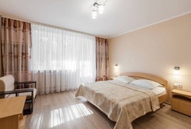 1-но местный 2-х комнатный номер Люкс в главном корпусе / 2 корпусе. В номере 2-х спальная кровать, в гостиной 2-х спальный диван, душ, туалет, умывальник / тв, утюг, холодильник, чайник.