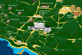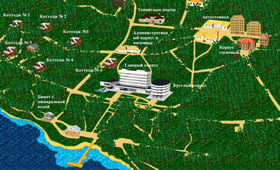 Размещение: главный корпус: 6 этажей; есть лифт. В корпусе находятся: столовая, киноконцертный зал, танцевальный зал. Круглый корпус: 4 этажа; есть лифт. Сосновый корпус: 2 этажа.
