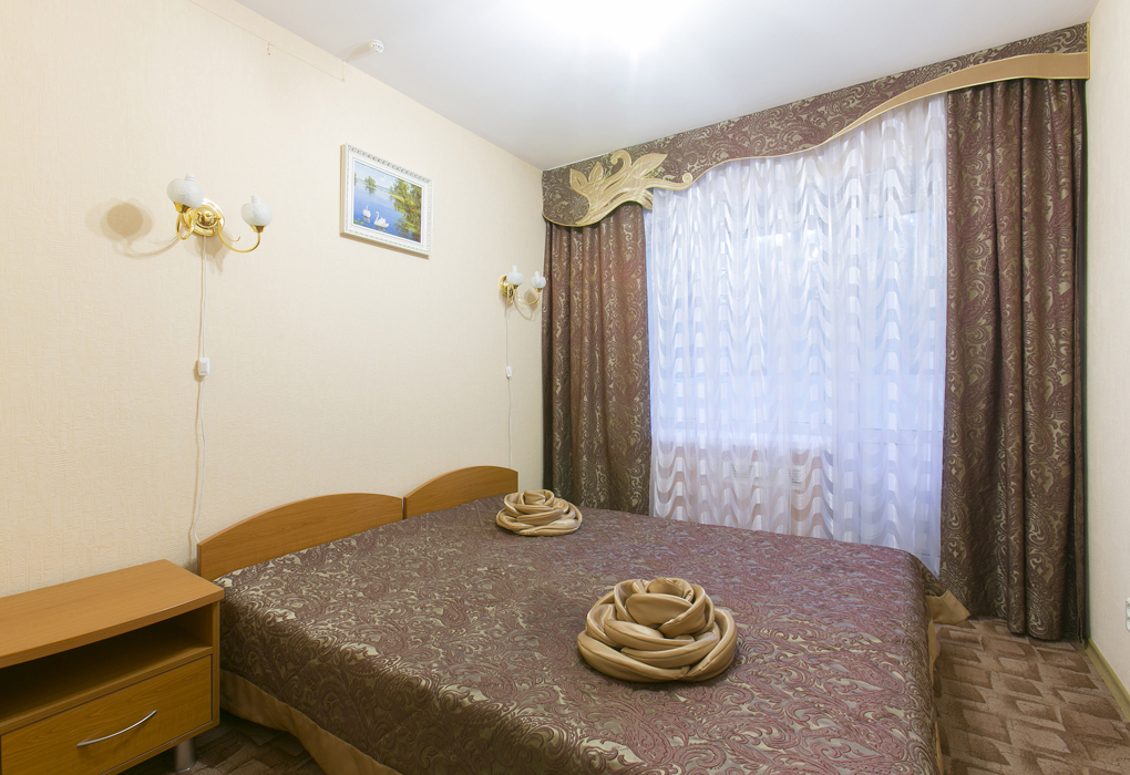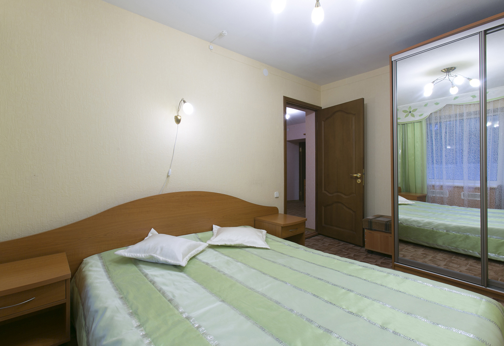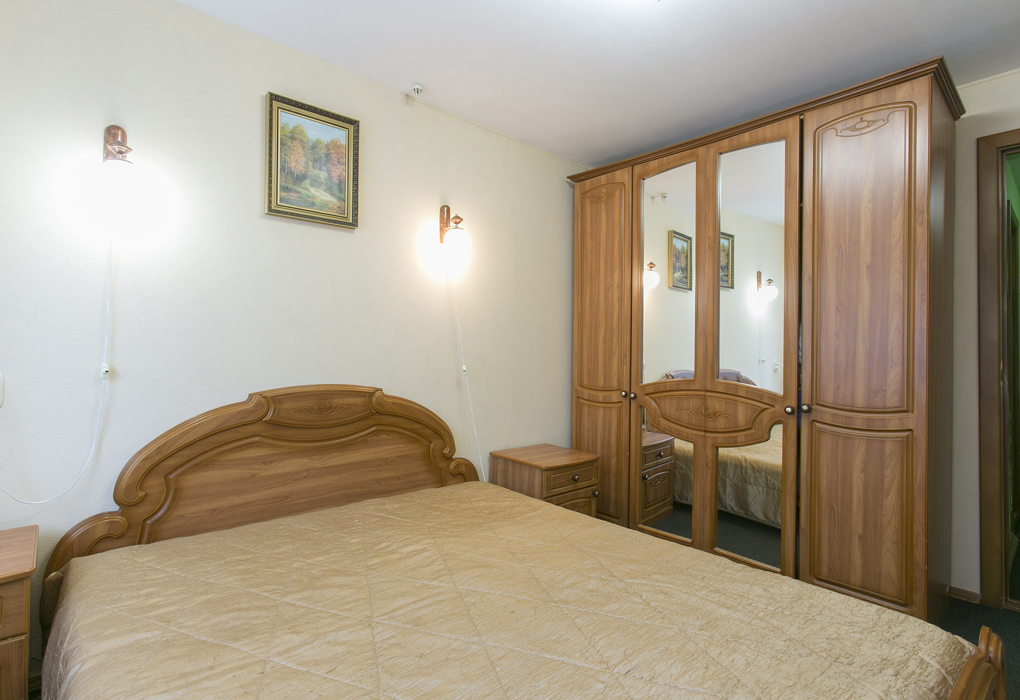 - Люкс 2-местный 2-комнатный: 2 комнаты (спальня с 2-спальной кроватью, гостиная с мягким уголком (диван раскладной), санузел (душевая кабинка, туалет, умывальник), кондиционер, застекленный балкон (на балконе стол со стульями, сушилка для белья), ЖК-телевизор, холодильник, фен, утюг, гладильная доска, электрочайник, посуда
