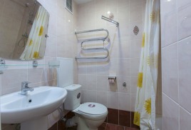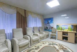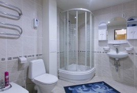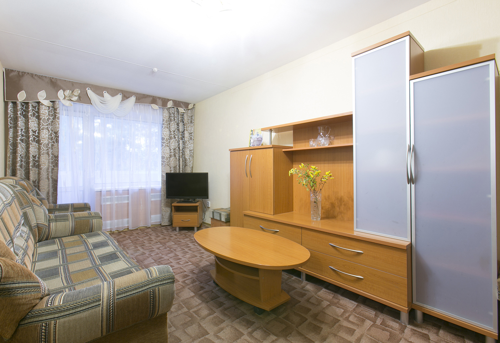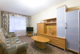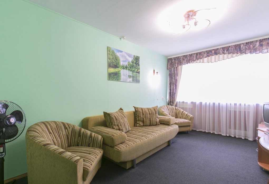 - Люкс 2-местный 2-комнатный: 2 комнаты (спальня с 2-спальной кроватью, гостиная с мягким уголком (диван раскладной), санузел (душевая кабинка, туалет, умывальник), телевизор, холодильник, утюг, гладильная доска, электрочайник, посуда