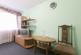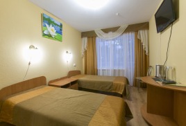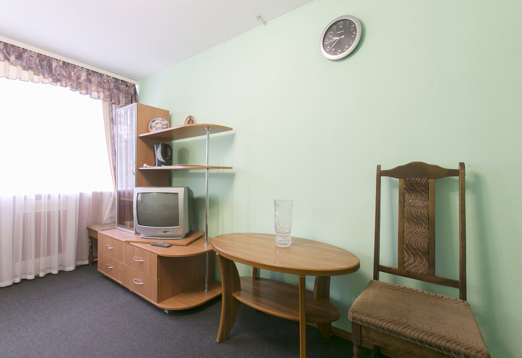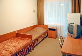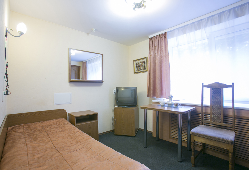 - Стандартный 1-местный: односпальная кровать, кресло-кровать (не в каждом номере), санузел (душ, туалет, умывальник), телевизор, холодильник, электрочайник, посуда