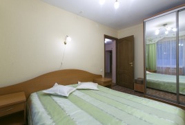 - Люкс 2-местный 3-комнатный: З комнаты (две спальни: одна со спальным гарнитуром и 2-спальной кроватью, вторая с 2-мя односпальными кроватями), гостиная с горкой и мягким уголком (диван раскладной), санузел (душевая кабинка, туалет, умывальник, биде), кондиционер, застекленный балкон (на балконе стол со стульями, сушилка для белья), ЖК-телевизор, холодильник, сейф, фен, утюг, гладильная доска, электрочайник, посуда.