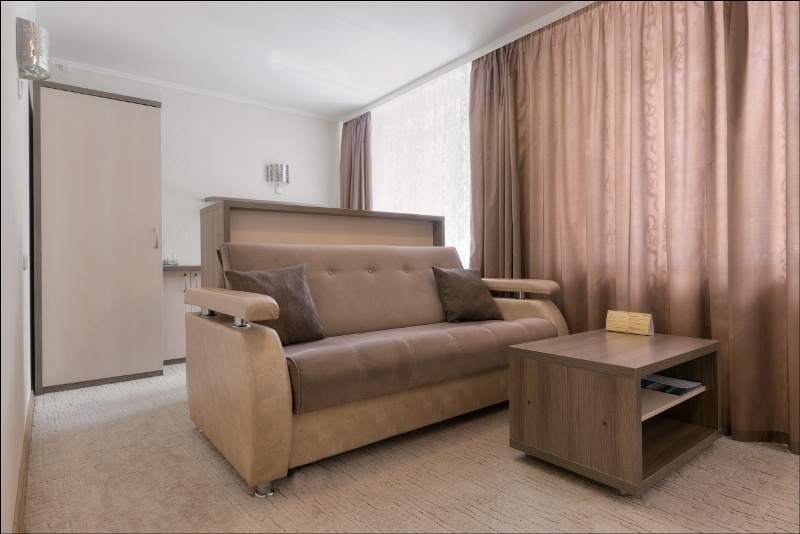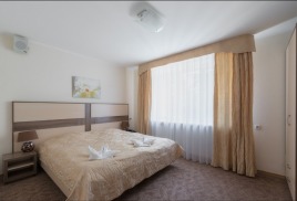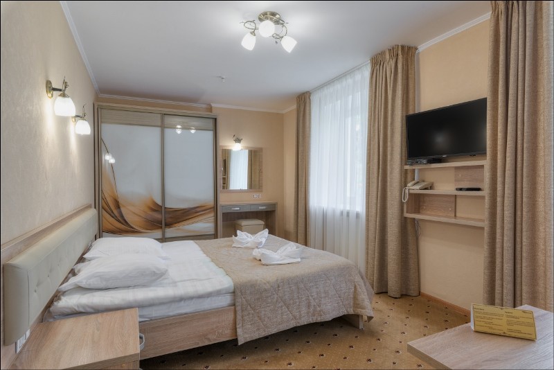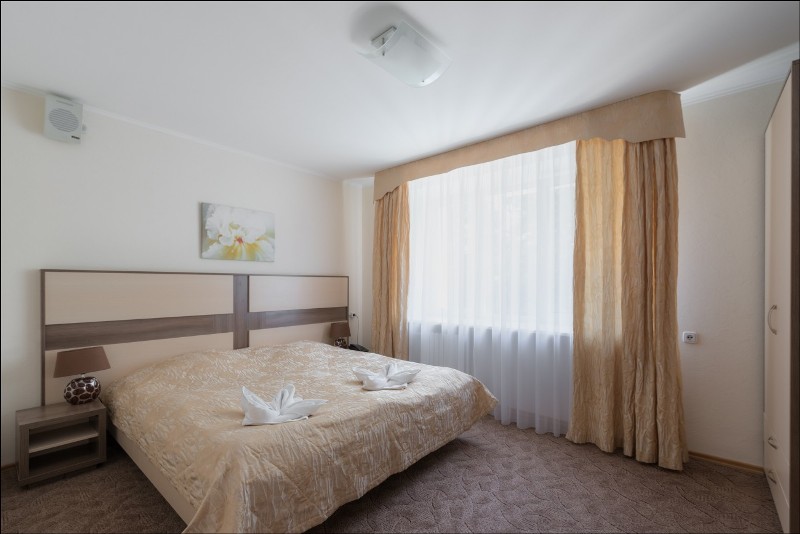 2-х местный 2-комнатный номер «Люкс» (P 40м). с удобствами (туалет, умывальник, ванна) двуспальная кровать, шкаф, диван, кресла, набор посуды, прикроватные тумбочки, бра, электрочайник, утюг, телевизор, фен, гладильная доска, сушилка для белья, кондиционер. Балкон - в каждом номере.