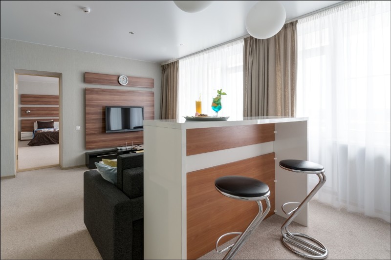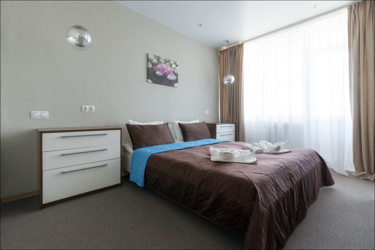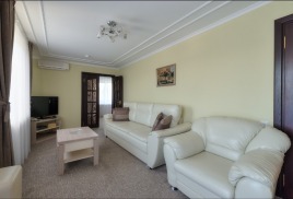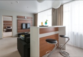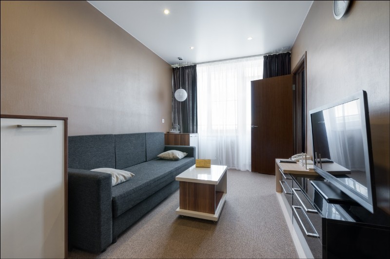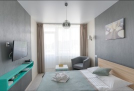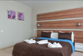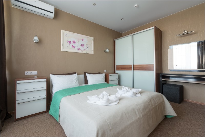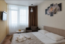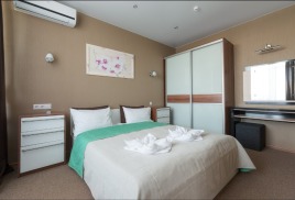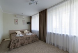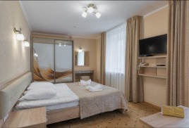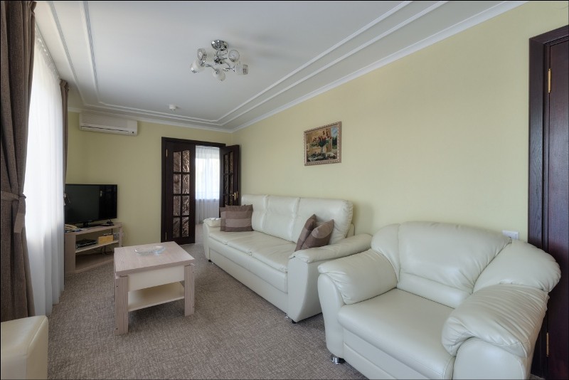2-х местный 2-комнатный номер «Люкс» (P 42м).(туалет, умывальник, ванна / душ) двуспальная кровать, диван, кресло, тумбочки, сушилка, электрочайник, гладильная доска, утюг, фен, набор посуды, телевизор, телефон, кондиционер. Балкон - в каждом номере.