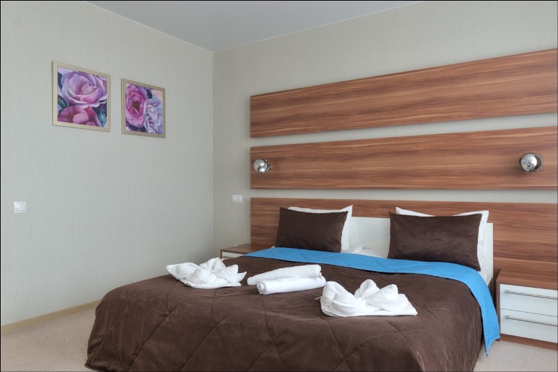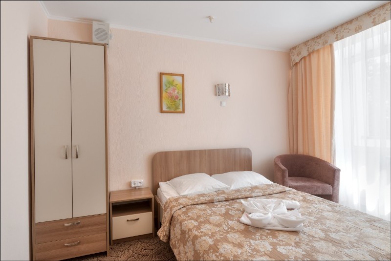 2-х местный 1-комнатный номер с удобствами ( Дабл, Твин) (P16м) (туалет, умывальник, душ) две односпальные кровати или большая двухспальная кровать (King size), тумбочка, лампа, шкаф, набор посуды, телевизор, холодильник, телефон.Балкон - в каждом номере.