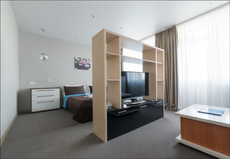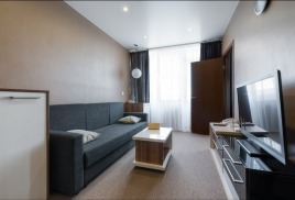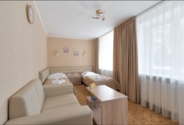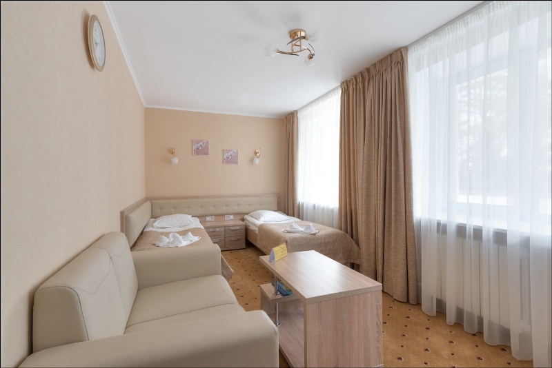 2-х местный 2-комнатный номер "Полулюкс" (P 24м) с удобствами (туалет, умывальник, душ) Кровать, шкаф, тумба под телевизор, диван, набор посуды, телевизор, холодильник, телефон, электрочайник, сушилка для белья, утюг, фен, гладильная доска. Балкон - в каждом номере.