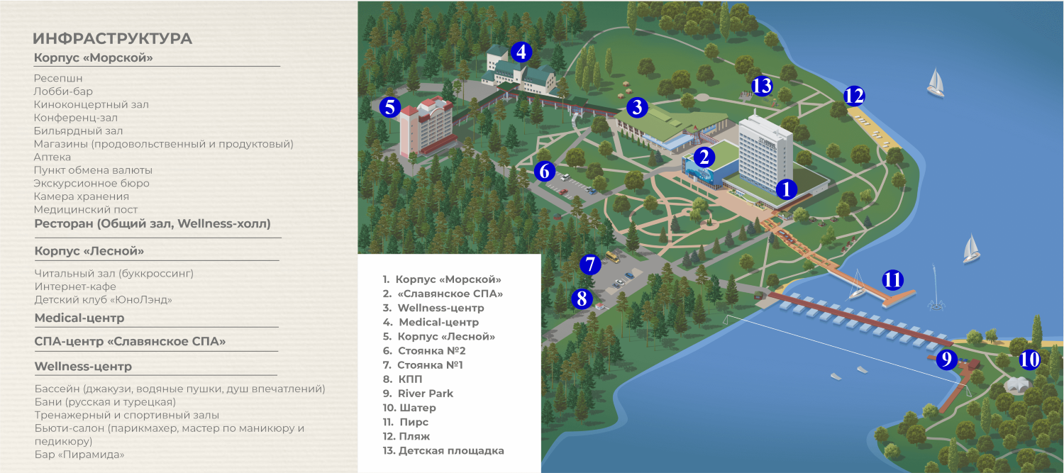 Корпус «Морской» 12 этажей; есть лифты, есть крытый переход в "Wellness-центр", "Медикал-центр" и корпус "Лесной". В корпусе находятся: ресторан, лобби-бар, киноконцертный зал, бильярдный зал, конференц-зал, галантерея маркет, продуктовый мини-маркет, аптека, экскурсионное бюро, пункт проката, пункт обмена валюты.