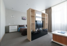 1-но местный 1-комнатный номер «Кинг Сайз» (P25м).с удобствами (туалет, умывальник, душ) двуспальная кровать, диван, шкаф, тумбочки, стойка под телевизор, телевизор, холодильник, фен, телефон, электрочайник, кондиционер, гладильная доска, утюг, сушилка для белья, набор посуды. Балкон - в каждом номере.