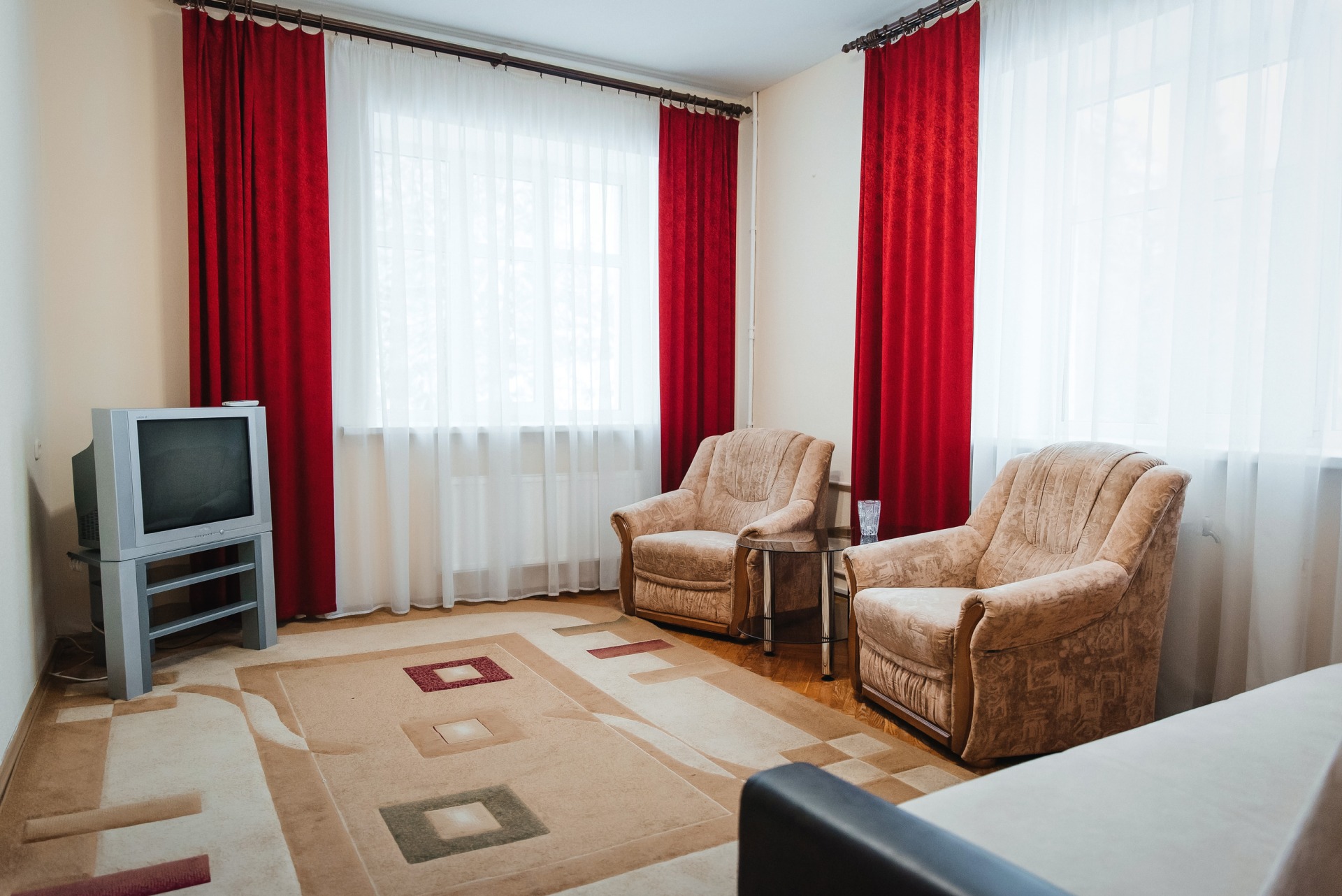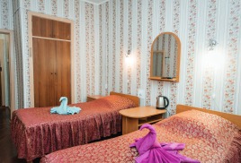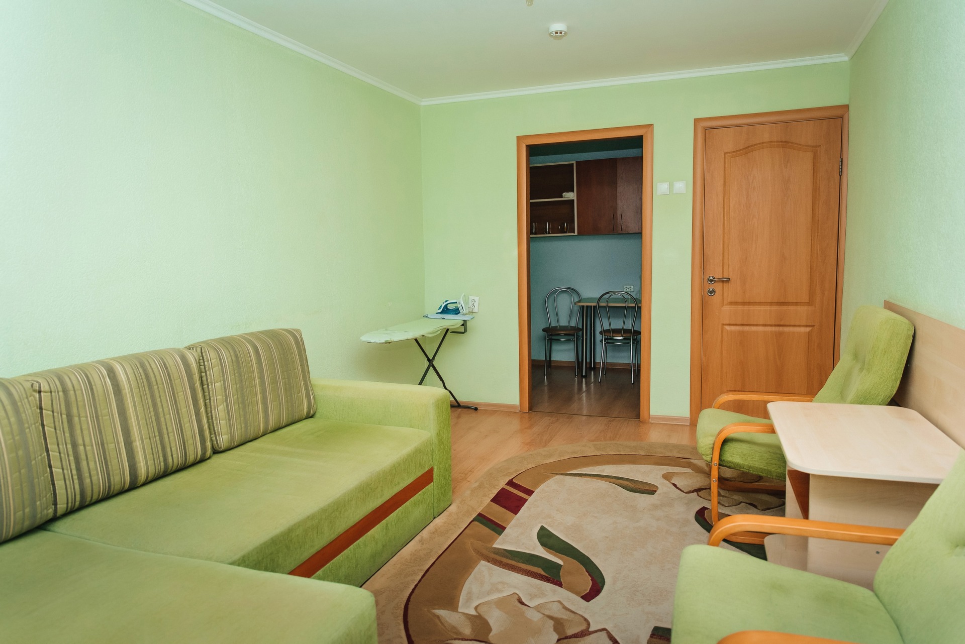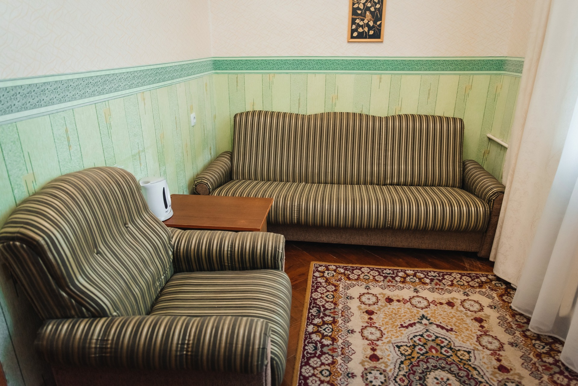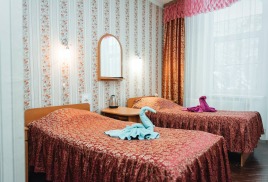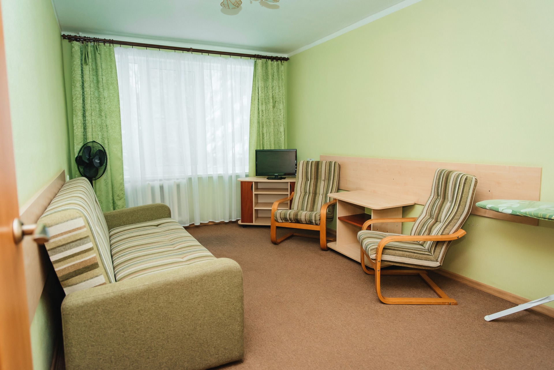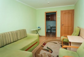 - 2-х местный двухкомнатный улучшенный номер: В номере две односпальные кровати, в гостиной мягкая мебель, ТВ, холодильник, чайник, душ, туалет, умывальник, небольшая кухня.
