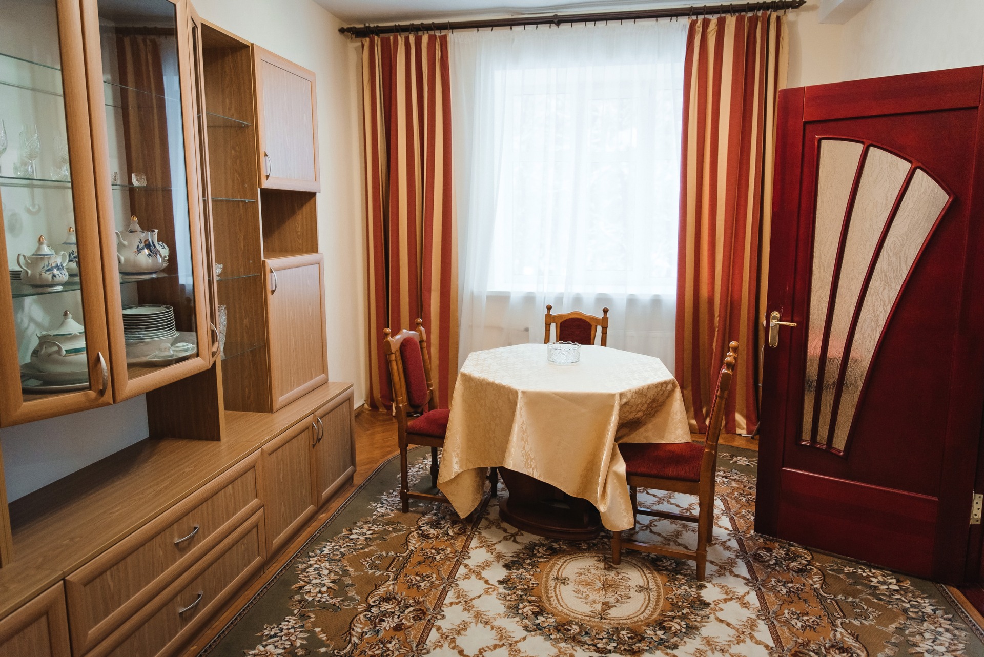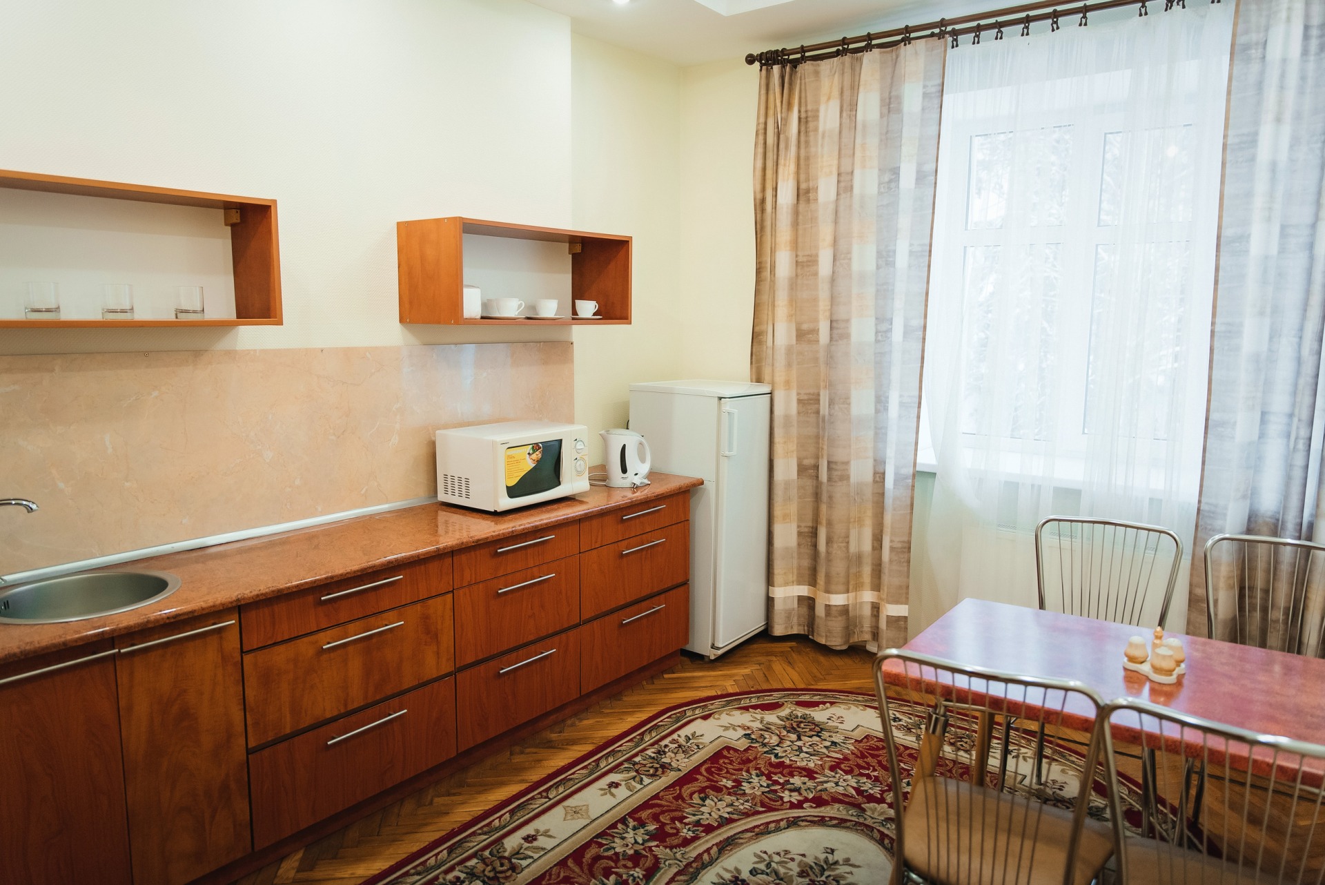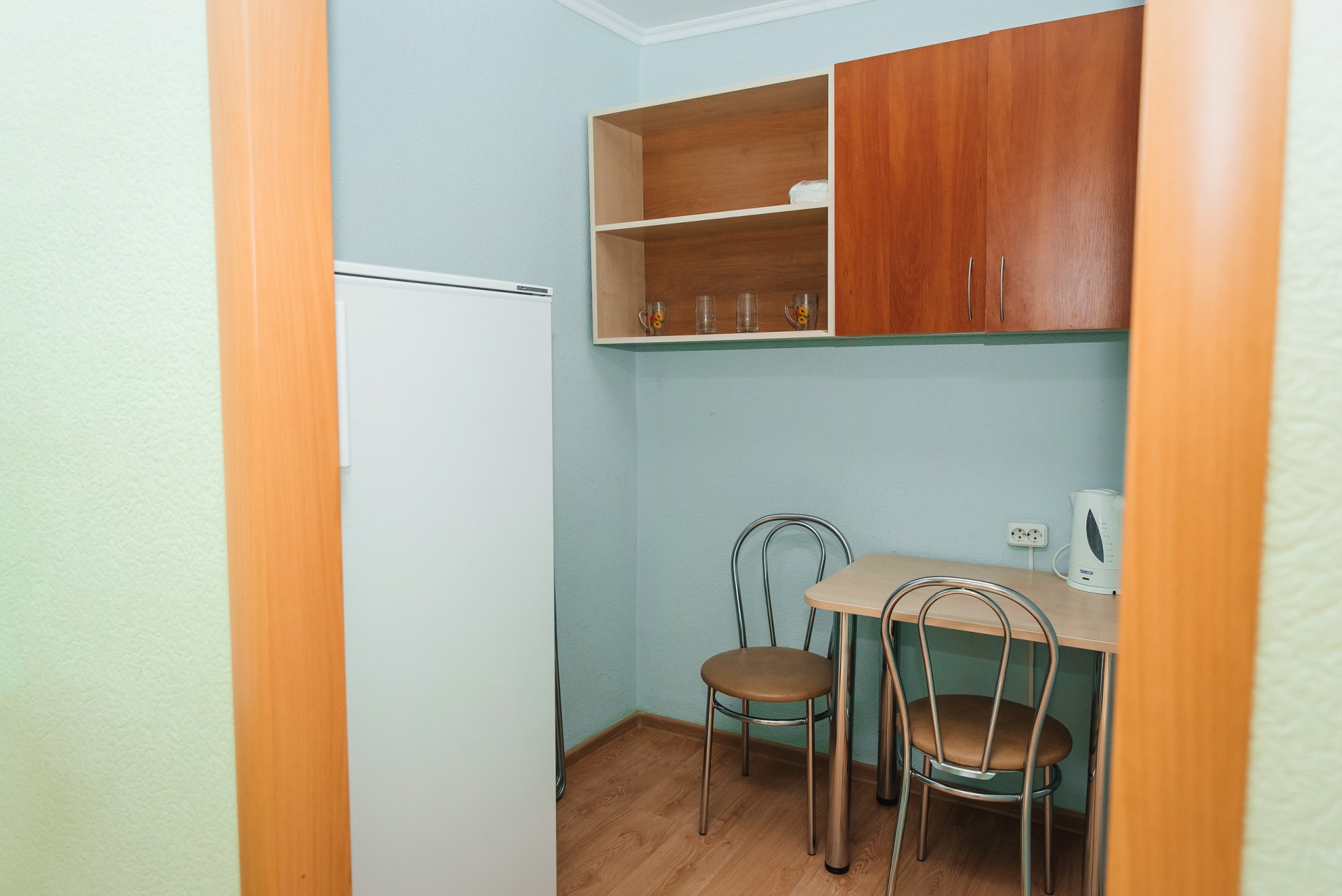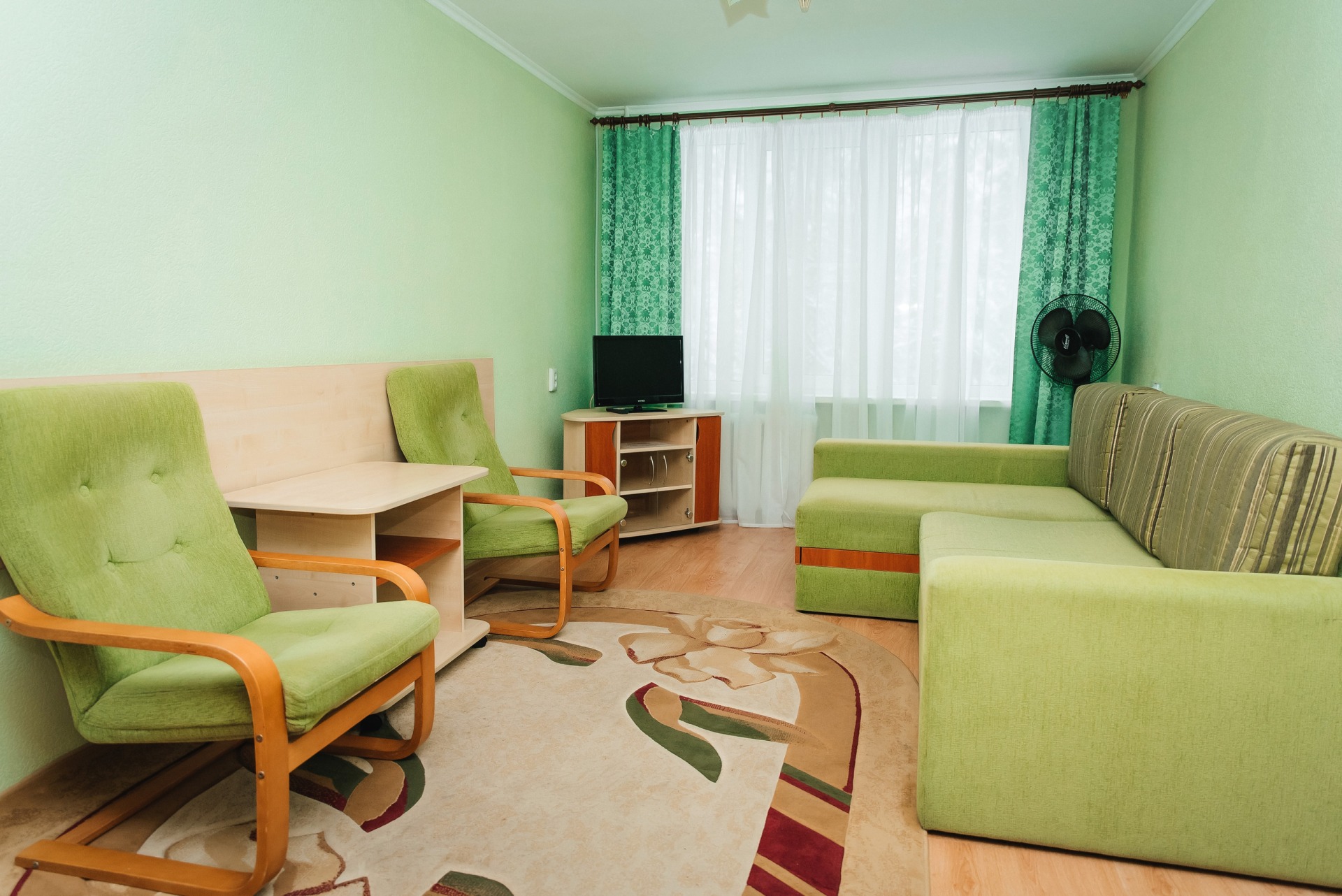 - 2-х местный двухкомнатный улучшенный номер: В номере две односпальные кровати, в гостиной мягкая мебель, ТВ, холодильник, чайник, душ, туалет, умывальник, небольшая кухня.