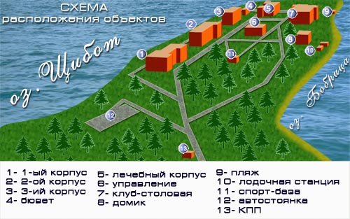 Номерной фонд: 3 спальных корпуса. Все корпуса отдельно стоящие, теплых переходов нет. Лифт есть только во 2-ом корпусе. Лечебный корпус 3-х этажный без лифта.