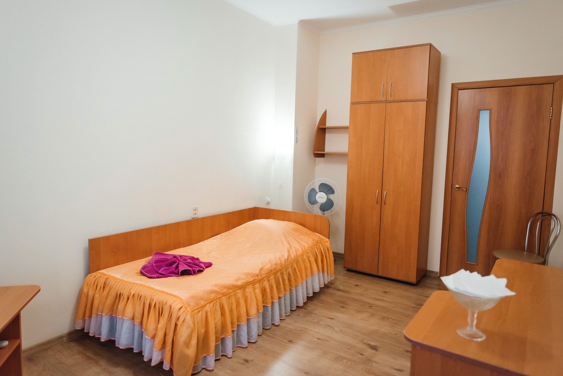 - 1-но местный однокомнатный: В номере односпальная кровать, ТВ, холодильник, чайник, душ, туалет, умывальник.