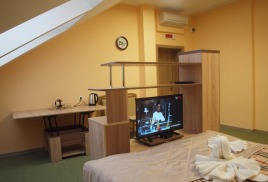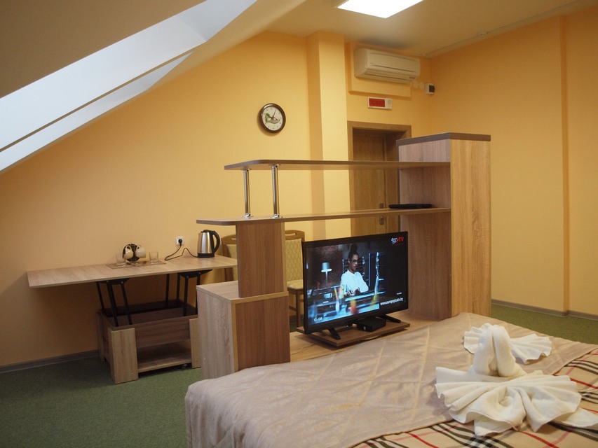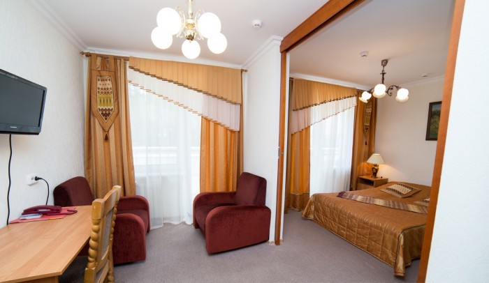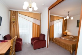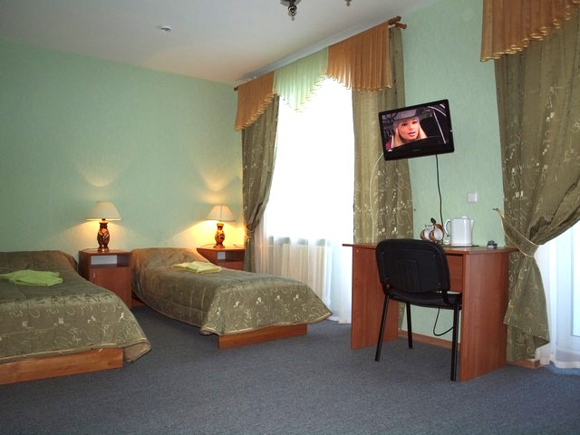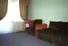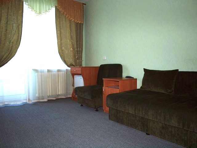 - 2-комнатный 2-местный улучшенный (25 кв.м): набор посуды, двуспальная кровать (1,5 м), ТВ, телефон, фен холодильник, чайник, набор посуды, ванна/туалет/умывальник. Дополнительное место: диван.