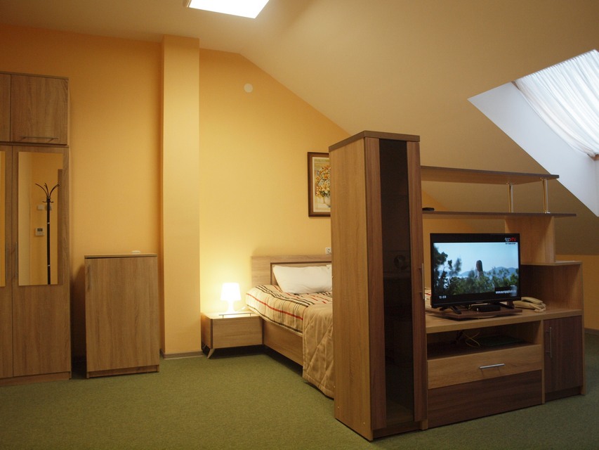 - 1-комнатный 2-местный (26 кв.м): набор мебели, 2 полутороспальные кровати (0,95 м), ТВ, телефон, фен холодильник, чайник, набор посуды, душ/туалет/умывальник, балкон. Дополнительное место: тахта.