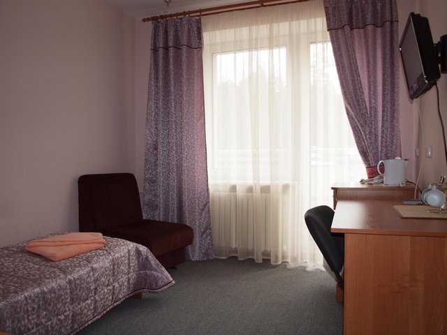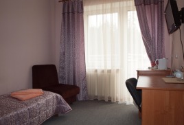 - 1-комнатный 1-местный (11-13 кв.м): набор мебели, полутороспальная кровать (0,95 м), ТВ, телефон, фен, холодильник, чайник, набор посуды, душ/туалет/умывальник, балкон. Дополнительное место: нет.